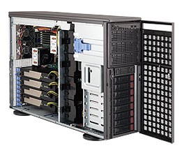 Supermicro's SC747 server/workstation chassis is truly industry's most powerful high performance server chassis that offers 9 full-height, full-length PCI-E expansion slots and 4 sets of 6-pin and 8-pin power connectors to support up to 4 double-width GPU cards. Optimized redundant high-efficiency (93%) Gold Level 1400W power supplies with PMBus support and optimized thermal solutions with 4 hot-swap cooling fans plus 2 hot-swap exhaust fans incorporating advanced fan speed controls, to accommodate the most demanding GPU applications.