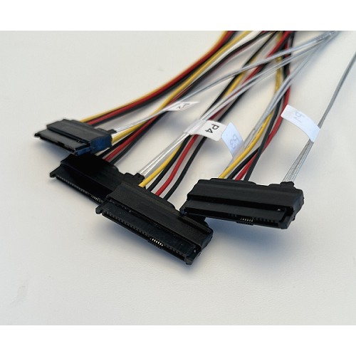 This Slim SAS 8i - 4x SAS Drive cable delivers high-performance internal SAS 3.0 connectivity for enterprise storage solutions. Featuring 1 SFF-8654 SlimSAS 8i connector and 4 SFF-8680 SAS drive connectors with 15-pin SATA power leads, they support 12Gb/s data rates for RAID, servers, and data center systems.