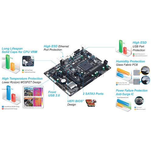 GIGABYTE AM1 motherboards are the latest range of next-generation desktop motherboards based on socket FS1b, supporting a new generation and high graphics efficiency of AM1 Athlon/Sempron-series APU, and also feature the latest specifications of native PCI Express gen 2.0, SATA 6Gb/s, USB3.0, etc. Not only delivering AMD's industry-leading performance and advanced graphics capabilities, GIGABYTE Ultra Durable motherboards are equipped with a comprehensive range of high quality components and unique features that offer mainstream PC users the most compelling platform on the market today.