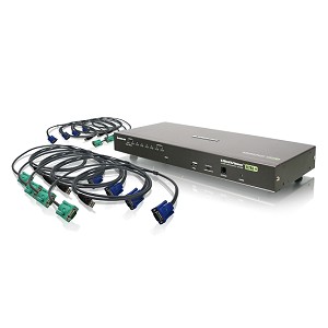 The GCS1808KITU KVM is a combo VGA switch that includes 8 USB KVM cables (4 x 6ft and 4 x 10ft). Access and control of up to 64 computers from a single console (keyboard, mouse, and monitor). As many as 8 additional switches can be cascaded bringing the total number of connected computers to 64 computers that can be controlled from a single keyboard-monitor-mouse console. A custom ASIC (patent pending) provides an auto-sensing function that recognizes the position of each station on the installation, eliminating the need to manually set the position with DIP switches. Additionally, the GCS1808KITU features high density SPHD 15-pin instead of the usual 25-pin connectors thus allowing for a compact design and installation in a 1U system rack.