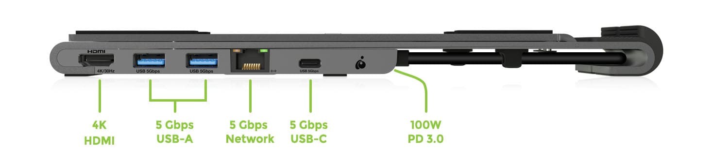 Innovative Compact USB-C Docking Station and Laptop Stand (PC or Mac) IOGEAR's 6-in-1 multi-functional laptop stand/USB-C hub extends one USB-C™ port to six useful ports: 1x HDMI®, 2x USB-A, 1x USB-C for data, 1x USB-C for 100W PD charging and 1x gigabit Ethernet port. Organize all your peripherals with this streamlined laptop stand. And there is only one cable from the base to your laptop - easy to disengage.